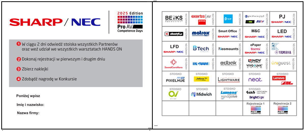 Podczas Pro AV Competence Days 2025 nie zabrakło konkursów dla Uczestników! Dla Uczestników obecnych na miejscu – odbył się tradycyjny konkursu dla aktywnych. Żeby zawalczyć o nagrody od Sharp/NEC oraz pozostałych Sponsorów i Patronów Medialnych trzeba było m.in. wypełnić swoje konferencyjne „paszporty” naklejkami z podróży po całej strefie EXPO.