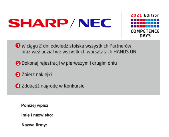 Podczas Sharp/NEC Hybrid Competence Days 2021 nie zabraklo konkursów dla Uczestników! Dla Uczestników obecnych na miejscu – odbył się tradycyjny konkursu dla aktywnych. Żeby zawalczyć o nagrody od Sharp/NEC oraz pozostałych Sponsorów i Patronów Medialnych trzeba było m.in. wypełnić swoje konferencyjne „paszporty” naklejkami z podróży po całej strefie EXPO. Z kolei poprzez platformę Meeting15 dla Uczestników zdalnych zrealizowane zostały konkursy online. A więc bez względu na to, w jakiej formie goście uczestniczyli w konferencji - opłacało się być z nami i słuchać uważnie!